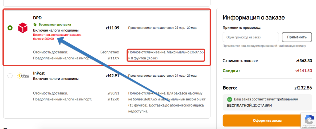 2) При оформлении заказа в корзине выбираем способ доставки DPD или InPost — работаем с обеими службами доставки