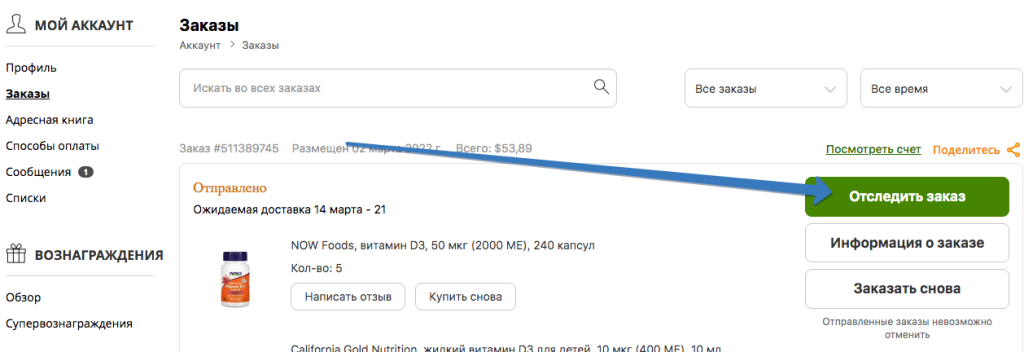 4) После оплаты в разделе «Заказы» — «Отследить заказ» отобразится номер отслеживания заказа. Этот номер необходимо добавить личном кабинете на нашем сайте.